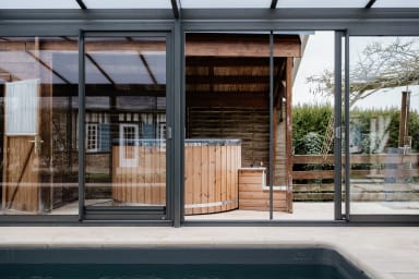 Une piscine sous grande véranda vitrée, utilisable toute l'année. La lumière naturelle entre de toutes parts, avec vue sur la longère et le jardin. À l'extérieur, un bain nordique à remous (37°C) pour les soirées étoilées et un sauna pour une détente complète. Le tout accessible en toute intimité, à n'importe quelle heure.